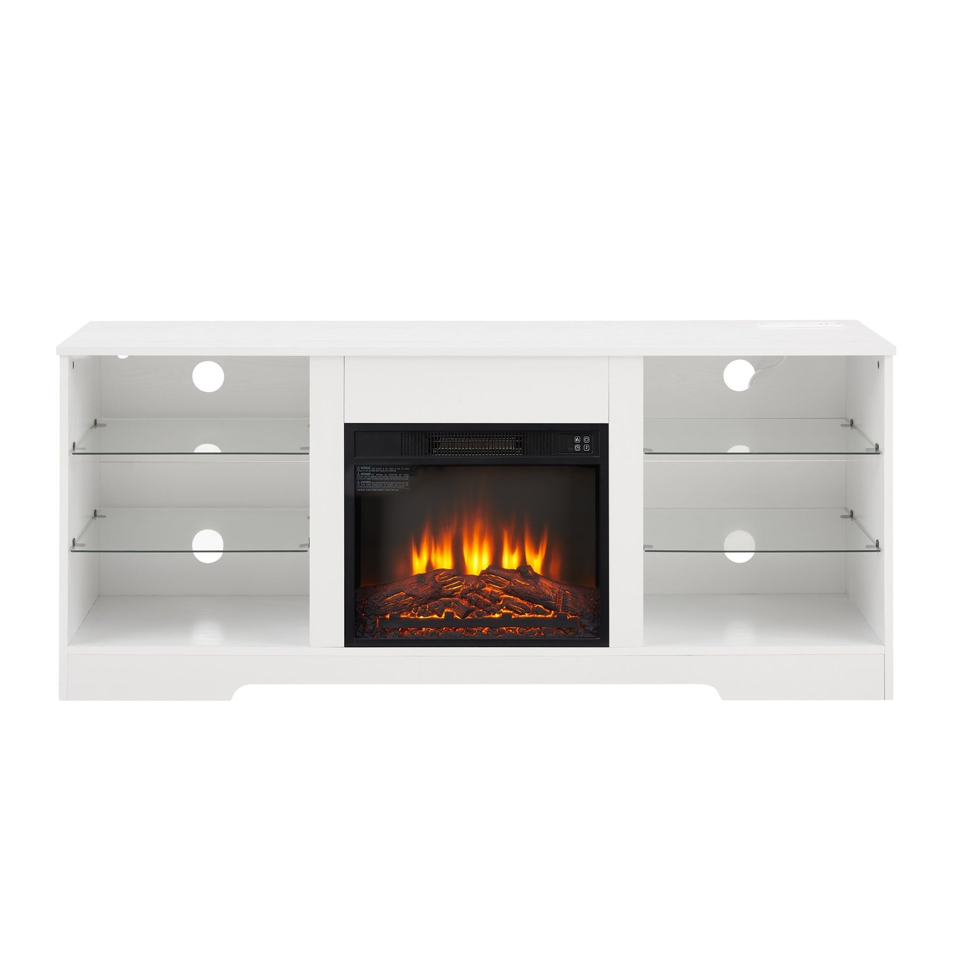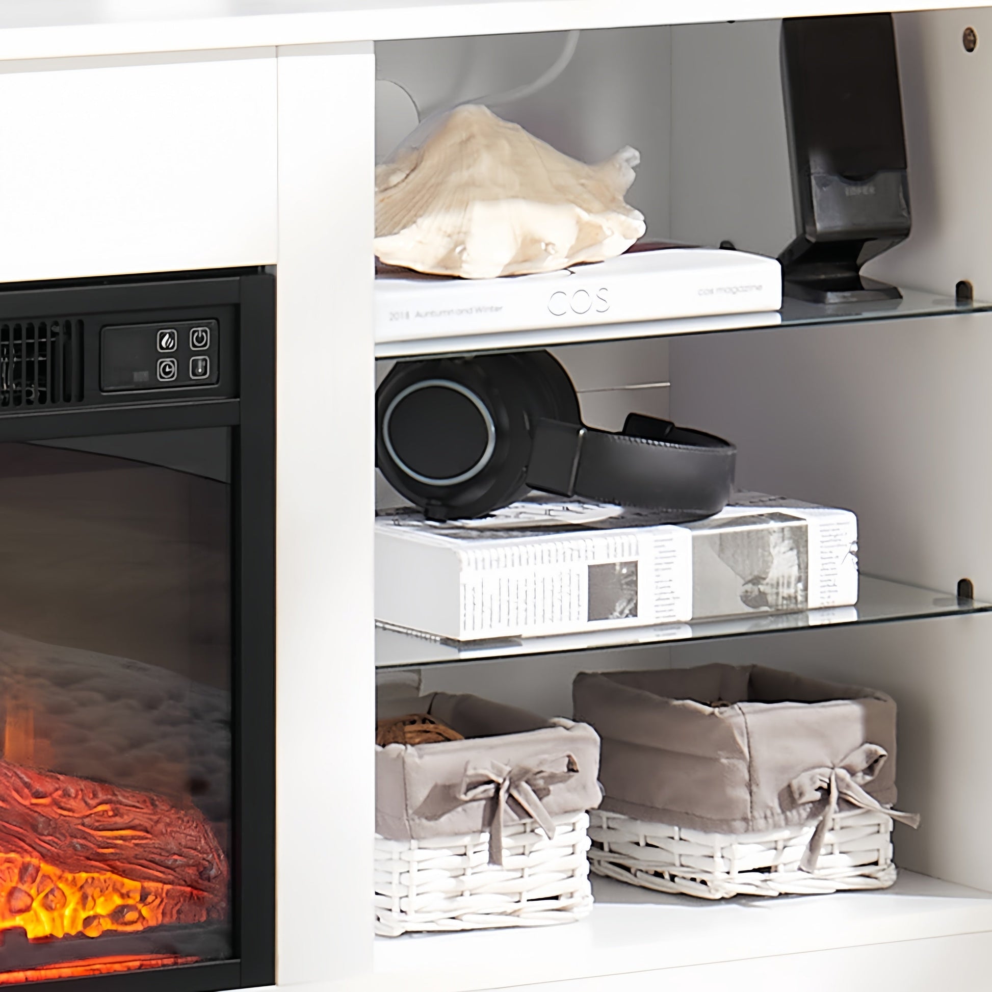 Transform your living space with the versatile 2-in-1 design of this TV Stand Electric Fireplace Glass Shelves. This 58" TV cabinet doubles as an 18" electric fireplace, creating a stylish and functional centrepiece in any room. With its innovative design, this TV stand also serves as a multifunctional indoor decoration. Experience the mesmerizing warmth and ambience of the fireplace from every angle of the front, making it perfect for cozy nights or chilly weather.