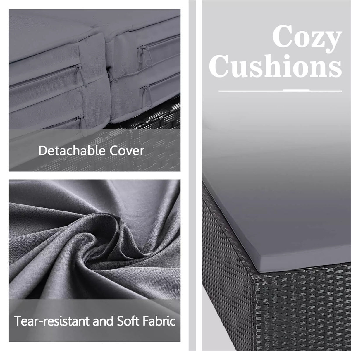 Experience ultimate relaxation with this gray outdoor rattan daybed, featuring plush upholstered cushions for added comfort. Perfect for enhancing your outdoor space with style and coziness.